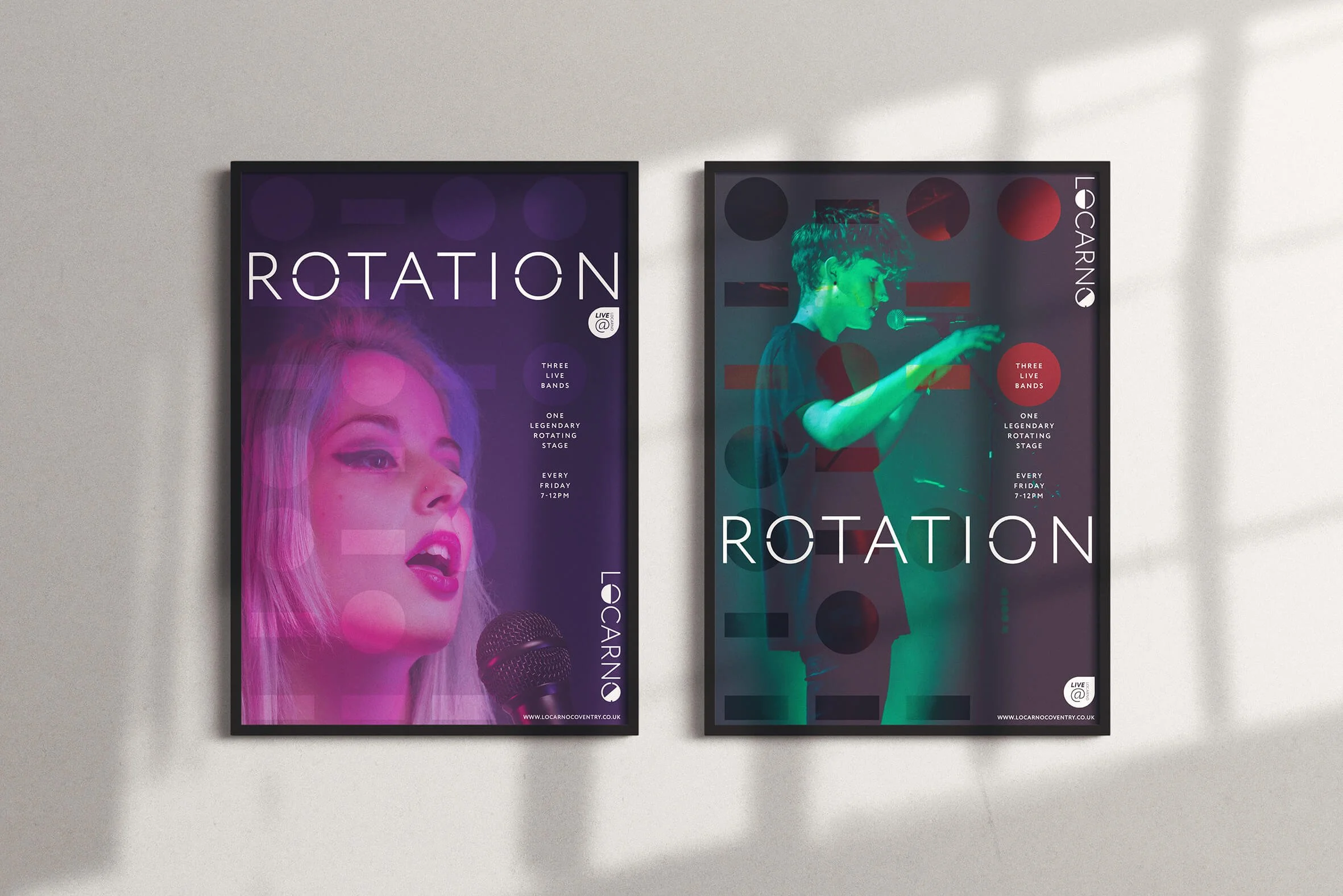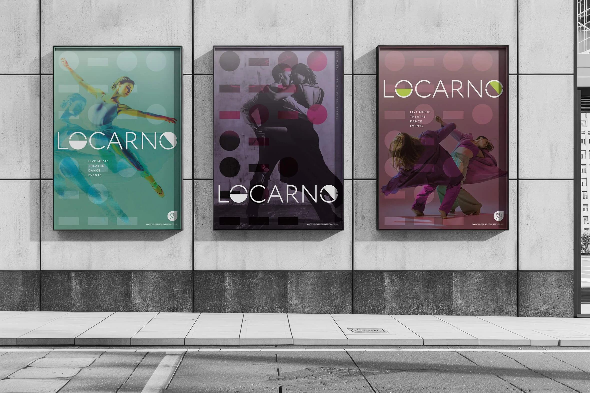Posters, window graphics, digital screens, social content, merchandise and the venue website have been designed to present Locarno as a fully realised, contemporary venue if it reopened today.