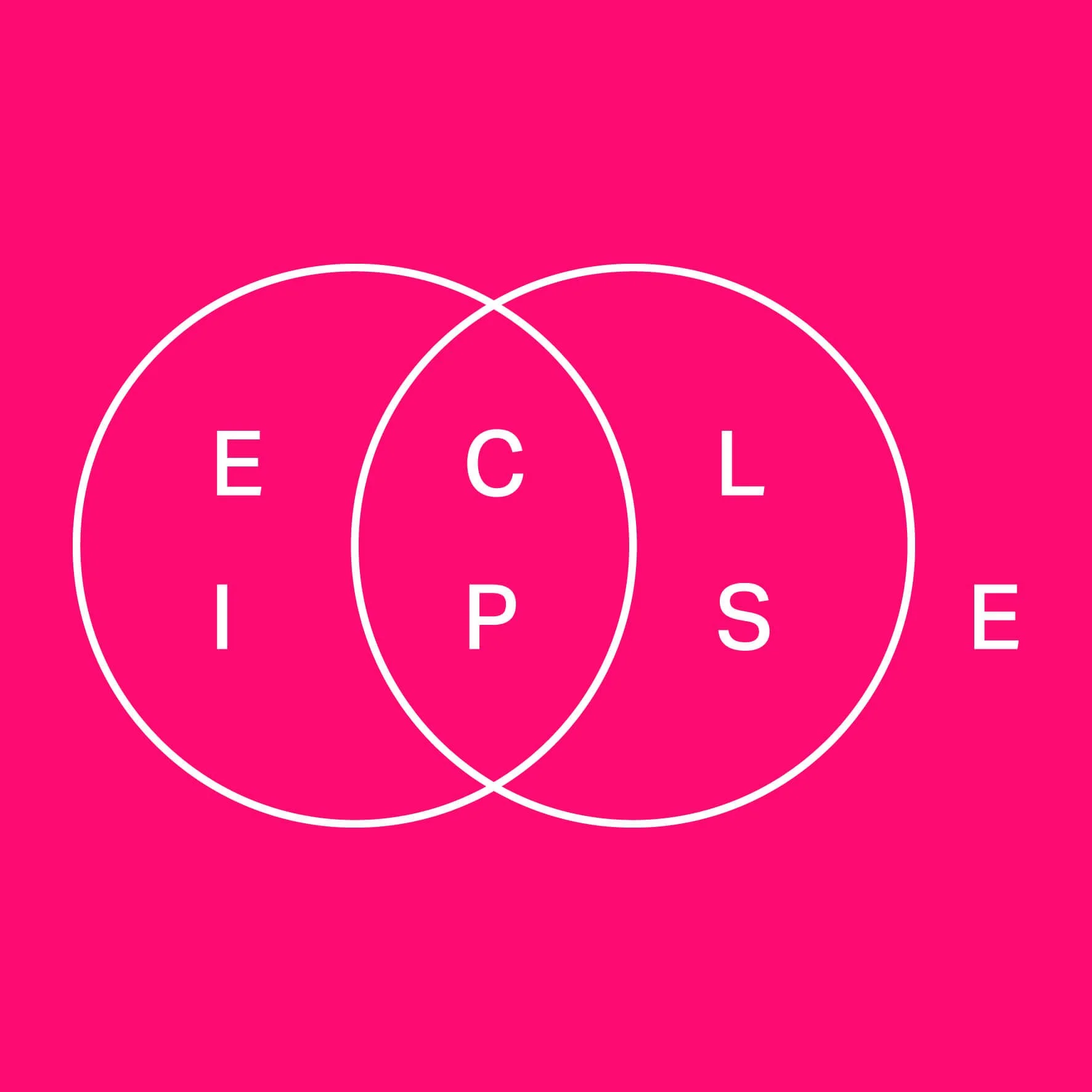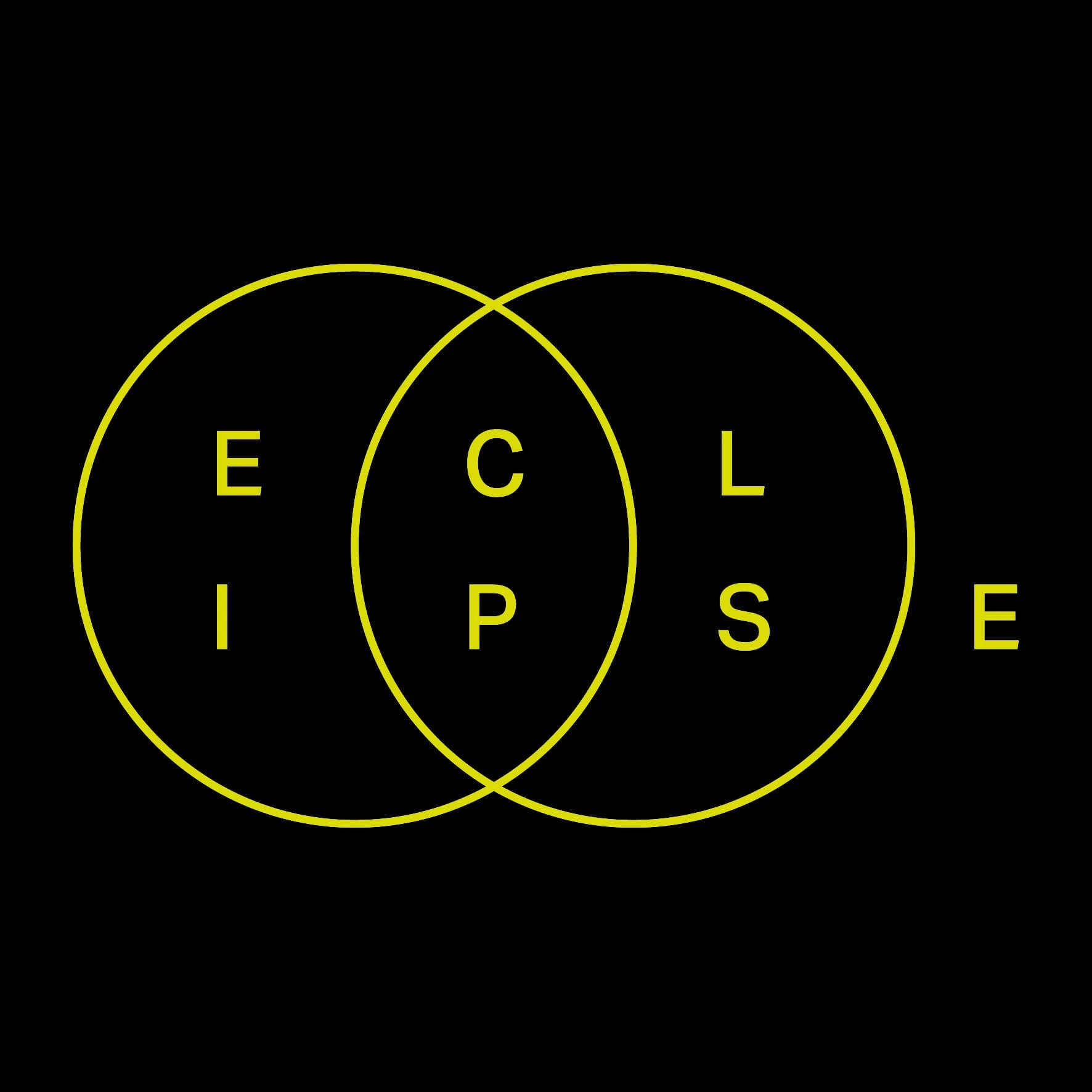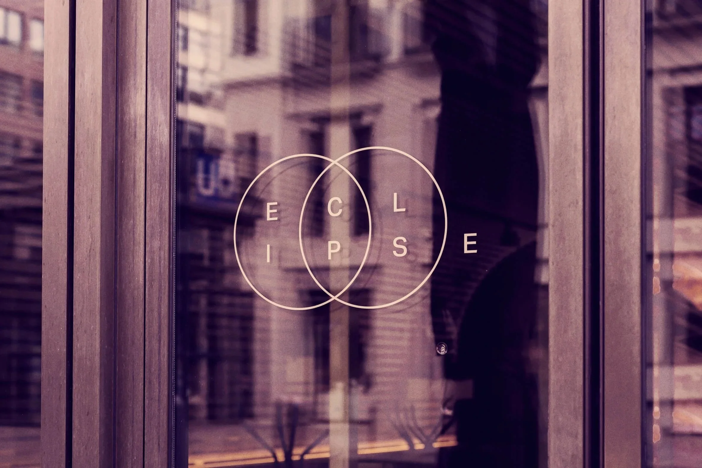 Two intersecting circles form the Eclipse logomark, inspired by the visual alignment seen during a lunar eclipse. This simple geometry creates meaning without complexity, representing connection, atmosphere and the moment where light and darkness meet.