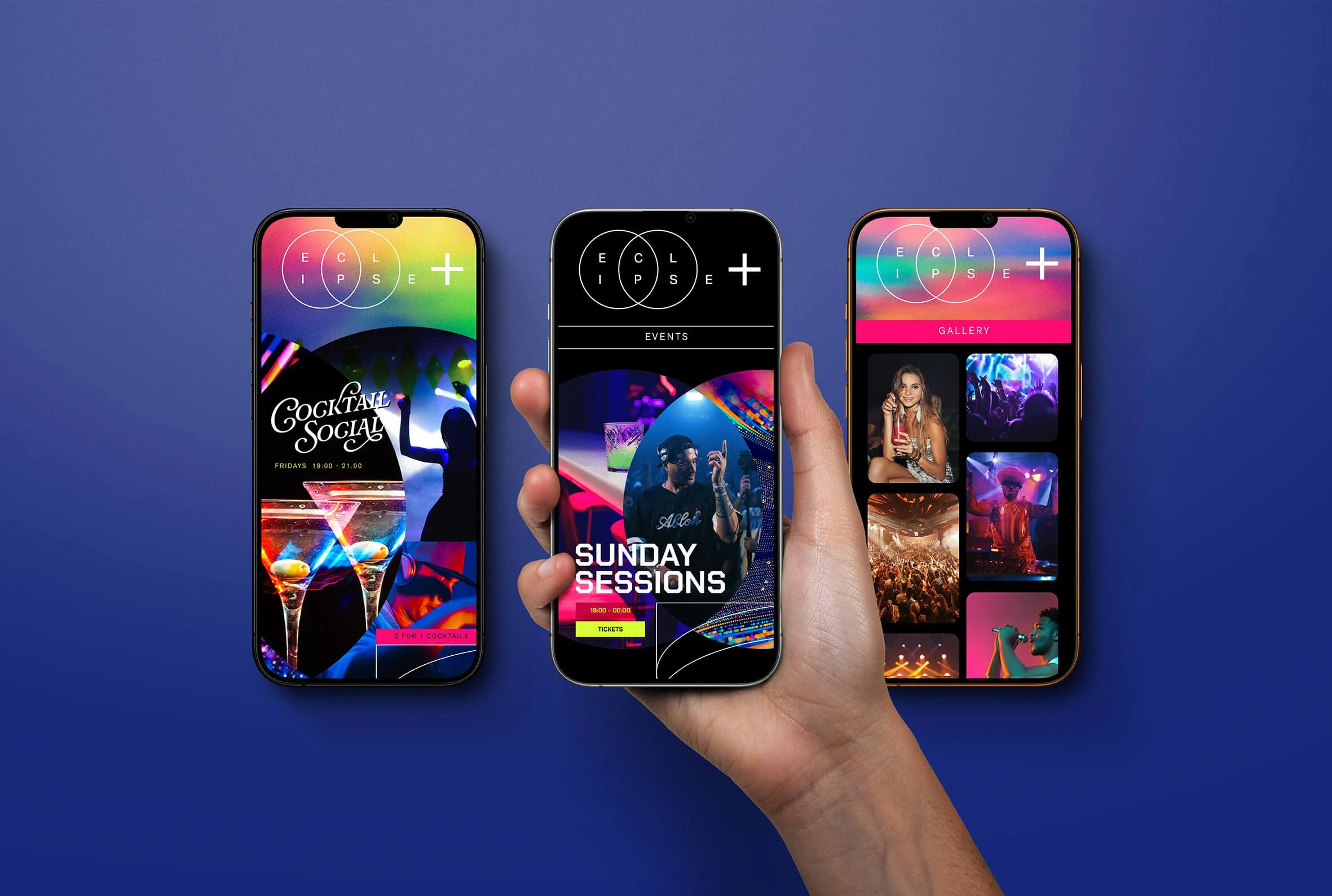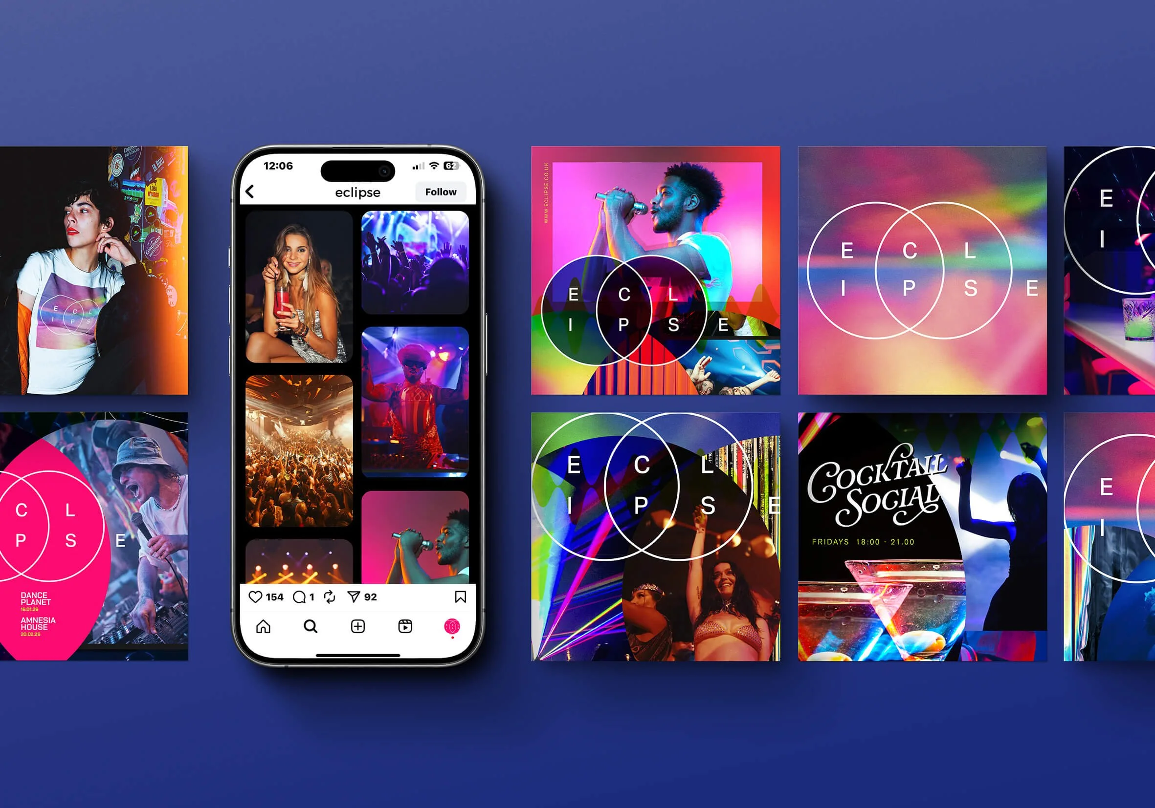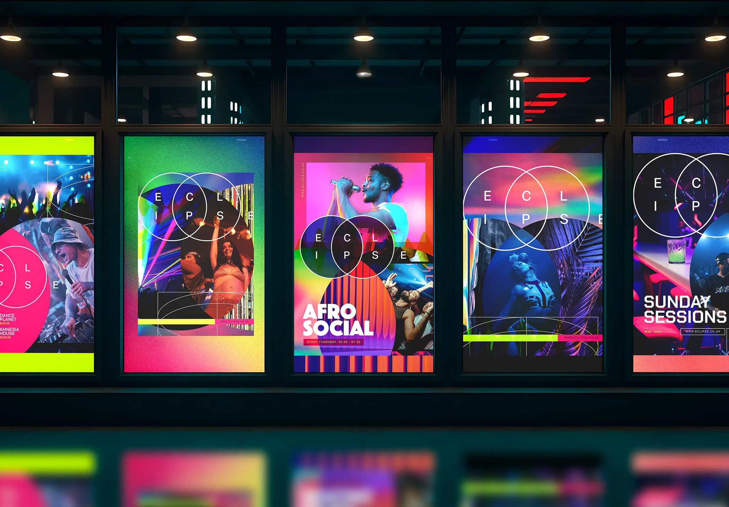 Signage, merchandise, posters, digital interfaces, event campaigns and social content have been designed to present Eclipse as a fully realised venue experience today.